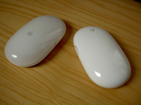 无线版的 Pro Mouse 和 Might Mouse,图片来自这里。Pro Mouse 即是传说中没有按键的鼠标,因为人们总是抱怨 Apple 鼠标只有一个按键,倔强的 Apple 就以一个没有按键的鼠标回应之。在正常视角中,这两个鼠标看起来是浑然一体的,如同一块完整洁白的玉石一样,这不仅得益于上表面不作按键分件设计,以及应用简洁的形体,还来自于越过最外点而朝内拐的设计,即截面最大处并不是零件边缘,而一般的模具成型,形状的最大处即是分件之处。