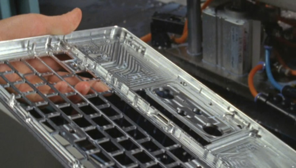 iPod touch 这个完整的背壳是用 0.5 mm的不锈钢板冲压成型的,因为最大截面在内部(腰鼓形弧线),使用了可收缩型芯,弧线设计既符合审美,比如左右的不对称,又符合人机工学,同时还要考虑到结构性能。这样的外壳设计必定会为结构设计和装配带来一些挑战性,首先需要有托架焊接到背壳上来支撑内部器件并强化结构性能,装备从滴到上,由于元件众多,所以厚度方向上的精度控制尤其重要,所以在托架和衬片焊接完成后需要进行 CNC 加工。