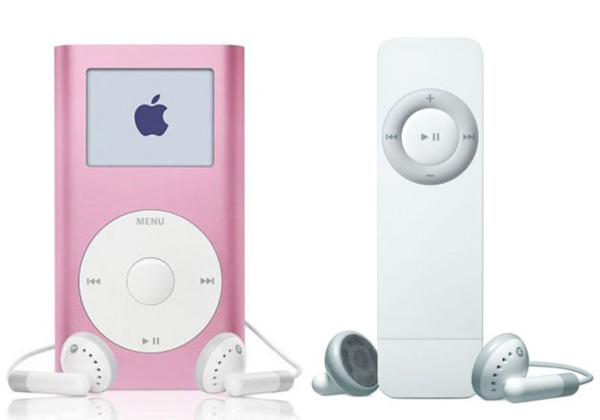 iPod mini 和第一代 iPod shuffle,iPod shuffle 一代使用了二次注塑的方式实现了零度拔模角的口香糖式设计,而 iPod mini 则使用了铝挤工艺,实现了完整无缝的外壳。