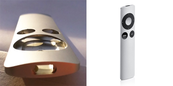 上图是 2009 年 Apple 发布的铝合金机身的遥控器(上图左来自这),从整个产品看上去就找不到一个开口,就像一块实心的铝,全身都没有缝隙。当然这种完全无缝之感,一部分来自于我们体验和认知的习惯,因为我们的认知习惯让我们倾向于认为它是一个壳体产品,它的腔体从上方直通到下方,而实际上,遥控器的下端就是实心的,而且它的腔体就是靠这些小于柱身的孔位向里挖掘的,而当这个孔位被塑胶按键给嵌入封闭住的时候,它的整体感就跃然而出了。