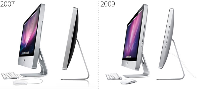 上图是 2012 iMac 更新前的两代,分别是 2007 年的 iMac,这一代使用的是塑料后背,所以前面一整个铝框架(包括下巴)是一体成型的,这一代的下巴的冲压并后加工成一条锐利的边缘的工艺,在以前文章《iMac 的那一道亮利的风景线》中介绍过。而上图右的 2009 款 iMac 就使用了铝合金的背壳,在加上焊接一块下巴,但是这是机身很厚,所以还没使用到后来的“搅拌摩擦焊接”。从 2007 年和 2009 年的 iMac 比较,你就能看到因为工艺的不同,也决定了一些细节的不同,比如 2007 款显示屏玻璃盖板是嵌入铝框架的,而且下巴上方(与显示屏玻璃配合处)是两个圆角,而 2009 款显示屏玻璃盖板是浮起来的,那么下巴也就是直通的。