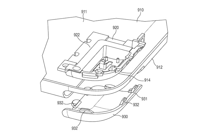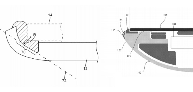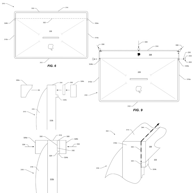 上图就是类似 iPod touch 第四代的边缘的处理,一圈的塑料镶边是在金属机身(不锈钢或者铝合金)注塑而成,上图左来自 US 9547338,上图右来自 US 9285833。 壳体上注塑材料在宏观上看是接近无缝的,当与玻璃相配时,玻璃的外边缘刚好是整个产品的外边缘,玻璃有一条小斜边也能增强边缘感,所以这个装配缝隙在通常情况下不容易被看到,而黑色的塑料镶边与金属机身的结合又是接近无缝的,产品就接近浑然一体。