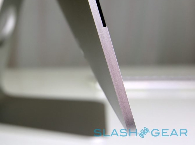 上图来自 Slashgear,可以看出两块材料的一点影子,但极不明显。在 2012 年 10 月份的发布会上,Apple 更新的 iMac 的设计,侧面厚度从此前较厚款降到 5 mm 时,Phil Schiller 在台上介绍做这个下巴用了一种焊接工艺叫做搅拌摩擦焊接(Friction stir welding),在当时的网站介绍是,因为新款 iMac 边缘部分太薄了,所以无法使用传统的焊接方法。