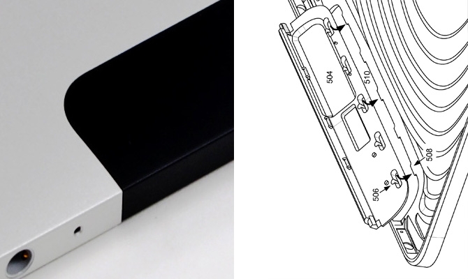 第一代 iPad 的 Cellular(蜂窝网)版因为需要支持多频段的移动数据网络,需要在全金属的背盖上开启一个让无线电波穿透的窗口,使用塑料来制作。上图所示的为第一代的 iPad Cellular 版本,上图左来自于 iFixit 而图右来自与 US 8345410 专利。iPad 上端的这一条塑料件与机身也是装配连接的,但是在外观面上几乎无法识别出缝隙,就好像是两种材料一体成型的。后续的 iPad 机型的天线窗口处塑胶件形态上有更新,但装配方式仍类似与 iPad 第一代,塑胶件是镶嵌上去了。