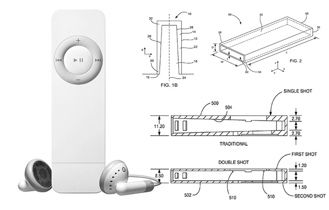 关于第一代 iPod Shuffle 上的二次注塑工艺可以参考 Apple 的这份 US 20110278312 专利。简洁的形态背后需要复杂的技术和工艺支撑,而这种结果的取得,无缝,一体性和纯粹的几何形态,并非是小题大作,用户可以体验到它的独特之处,而是这种特征在当时是 Apple 独占的,不只是他们能做到,他们去做到,更重要的是他们能想到。