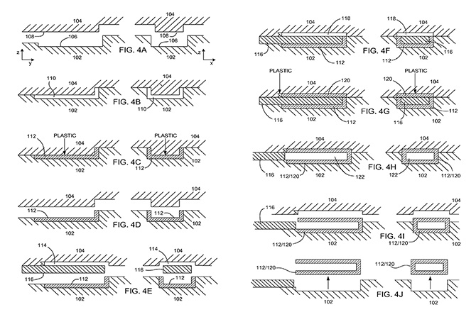 上图 FIG. 3 就是柔性的金属套筒,而 FIG. 5 是将装入套筒的内芯。套筒具有抛光的外表面,使用底摩擦性的金属做成,便于在塑胶内壁滑出,套筒上开一整条槽,使得套筒能具有一定的弹性,与之相配的内芯有一条凸起的键,套筒和内芯组成了模芯。注塑过程就是先将套筒装到内芯上,然后合上外模,完成注塑,将注塑成型的塑胶件和套筒从内芯上拉出,此时套筒在塑胶件的内壁上,因为套筒具有一定的柔性,它让内收缩,就可以从塑胶件内壁中抽出。FIG. 9 就是模具合上后的注塑过程,而 FIG. 12 是柔性的金属套筒在塑胶件(图上举例为三棱柱)内壁发生了弹性形变。详细可参考阅读 Apple 的这份专利——US 20150367545。