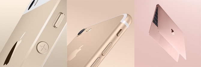 如上所说,在 Apple 的主打产品上不会出现彩色,但也不能仅限于黑白灰这些本色,因为颜色在产品设计上的价值就越来越重要,尤其是像 iPhone 这样量级的数字消费品。Apple 在 iPhone 5s 上引入了一个金色,与同时的银色和深空灰比,它是一种彩色,但是它又是除银色和深空灰外的唯一的颜色,另外,金色不是黄色,它有“金”的属性,除了视觉属性外,还有它的社会属性,而且铝的阳极氧化颜色对金色又有独特的表象力,通过表面砂粒和反光属性让其在使用过程中有着丰富的表现,在硬直的 iPhone 5s 上表现更出色(可以与金色的 iPhone 6 等作比较)。这种独立且独占的颜色这里我们称之为专色,iPhone 5s 的金色是非常成功的一个颜色设计,不只是商业上以及带起的一股浪潮,而是,或许再难找到一种新的这样的颜色了,尤其是铝合金的手机上。后来 Apple 又推出了玫瑰金色的设计,虽然从颜色的品质上并不比金色相差多少,但是它的表现力无法与iPhone 5s 的金色相媲美。