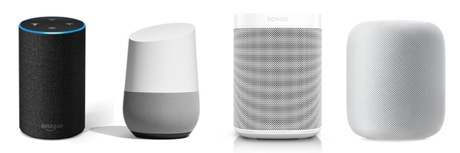 Amazon Echo 2 从纯工具性和设备化的第一代 Echo 设计上作出改进,减低了高度,去掉了顶部的一条接缝,并且增加了具有不同材质选择的罩壳,诸如木纹和布纹,使其能够更加融入家居环境也能削弱它的工具感,Amazon 采取的设计和处理手段仍是程式化,即普遍的手段,并没有在工艺上作出突破,也没有在整体形象的塑造上有更进一层的追求,加上一圈 LED 灯效的设计以及顶部物理按键及直接安置的麦克风,Amazon Echo 2 仍然是一个工具和设备。Google Home 则直白地表达了对识别性的追求,所以设计了一个独特的几何形态,而斜面的设计一方面指示着喇叭的朝向,一方面也能方便手指交互操作(尽管对于一个智能语音设备来说并非主要),从这一点来说这个几何形态的设计并非过于任意化。但是从 Google Home 的拆解图中可以看出,尤其是上半部分的结构布置,浪费了的空腔结构,它并不具备很强的内外一体性,作为形态导向的设计,Google 并没有在构造的内外一体性上有更多的追求。而这样的几何形态设计就必然会带来几条接缝,在破坏产品的一体性,Google 通过对下部罩壳的材料和颜色的设计来弱化这一点,但灰色以外的罩壳设计总是很突兀,加上独特的几何形态,让这个产品过于前台化,与其产品“隐在”的内涵特征相背。Sonos One 则是从传统的音箱设计上进化而来,剔除了 Sonos Play:1 顶部的物理按键设计,以及复杂的顶面内凹形态设计,替换为触摸式设计,但是触摸按键的符号仍是刻印在表面,加上一组环形麦克风排列,仍倾向于旧时代的工具化设计,尽管设计和工艺都很精致。