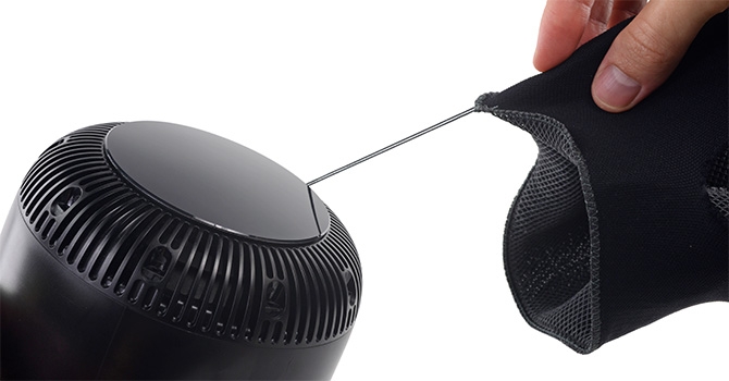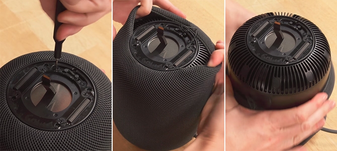 首先须在结构上将网布锁定机身上,如果在物理上都无法让网布来紧紧裹住机身,现象感知上的整体性就无从谈起。如 iFixit 的拆解中可以看到,网布牢牢地固定在机身上之后,再用上端的触摸显示组件,以及下端的封口和缓冲构件封住了网布两端的开口,而且两端的开口埋很深,比如上端并非是用玻璃盖板的封住,而是用玻璃盖板下的 LED 显示组件,所以无论如何,这个网布的开启口只是留给制造的,对用户来说它可以说是不存在的。网布下端通过胶水粘死在机身上,而上部则由收口的拉绳经缠绕由螺钉固定在机身上,此处结构的巧妙是留给装配和生产的,而不是用户。