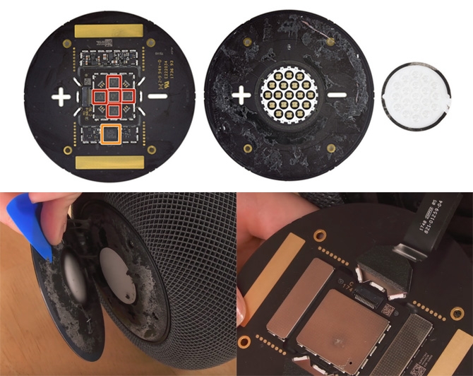 HomePod 的触摸操作板上并没有使用屏幕,而是使用了 LED,“+”和“−”各自有单独一片,而波形图则是通过如上图所示 19 粒 RGB LED 灯片,通过德州仪器的 TLC 5971 来驱动(见 iFixit 介绍),可控制 RGB 每一粒小灯珠来形成波纹,并且通过扩散膜(LED Diffuser)来形成雾化扩散的动态效果,而且相对应的玻璃盖板上也有一层扩散膜。形成的波纹图案和 iOS 上的 Siri 的视觉元素很相似,会让人误以为是通过屏幕来实现图案的显示的,所以 HomePod 通过软件和设计,用了简单有效的硬件来实现了所需的最终效果。(上图来自于 iFixit 及其拆解视频)