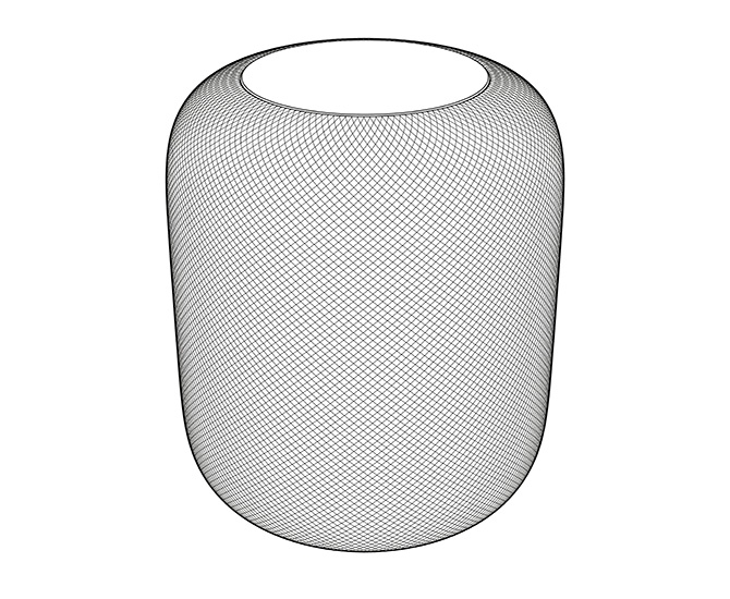 网格的成型,尤其这些形态上有渐变的几何形态,通常会想到使用算法,比如通过 Grasshopper 等软件来绘制,但是无论使用怎样的方式,首先需要去发掘生成的机制,如果确定了生成机制,在 Grasshopper 或者其它基于算法的成型软件上,只要控制不同的参数输入即可。而 HomePod 的网布网格无需使用到算法成型,因为它是通过简单的圆周阵列而来,只需要知道其中一条线是如何成型几何。