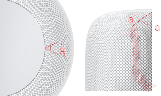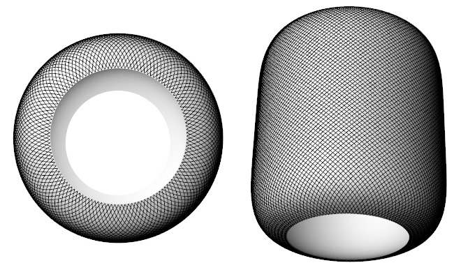 在 HomePod 官方页面第一版(archive.org 存档)中有一张技术参数的图,即上图,绘制的网格与其他图形不一致,目前官方图片以及上市销售版的 HomePod 的网布的网格都是 128 组(即共 256 条线),而上图是 100 组(200 条线),而且一组两条线在顶端形成的夹角将近有 80°。