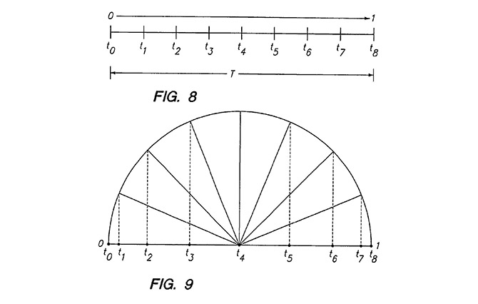 上图是 Genie 效果中窗口轮廓的变化过程,来自专利文档 US7362331。这个设计的一个特点就是变形后窗口的外轮廓,当从 QR 为上边的四边形窗口变形移动到 S’T’ 为上边的四边形窗口(或图标)时,窗口的左右轮廓由直线变成了曲线,而这两条曲线在这为正弦曲线(当然它可以是其他曲线),来自函数 y=A sin(x) ,x 为图面垂直方向的距离,正弦曲线的范围定在 −π/2 和 +π/2 之间,y 为图面水平方向的距离,A 为振幅,从零到 SS’ 和 TT’ 的一半。所以当窗口当前位置确定,以及目标位置确定,左右两条曲线就能确定,窗口就沿着曲线向下缩小和移动。
