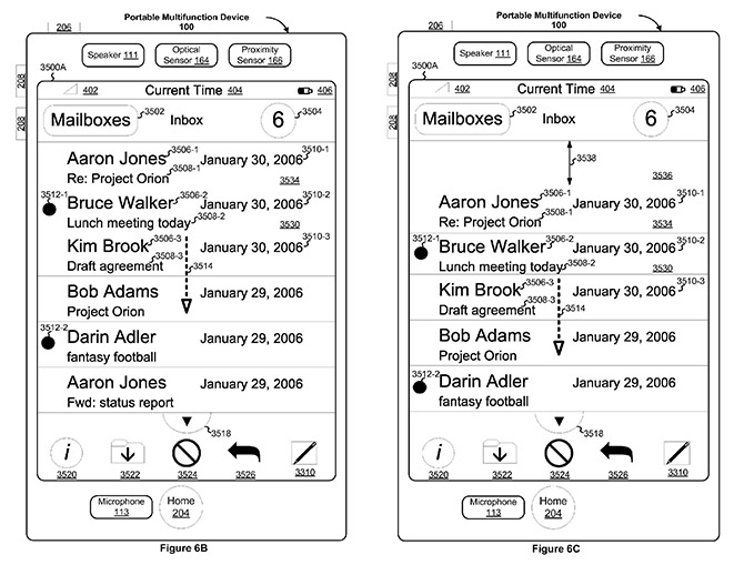 上图来自关于 iOS 中 Rubber band 的专利 US7469381,涵盖的范围除了列表滚动至两段有回弹效果,还包括文档平移到边缘有回弹效果,文档缩小到最小有回弹效果,文档放大到最大有回弹效果,文档扭转(但未达可扭转要求)有回弹效果。上图所示的为列表滚动时出现的回弹效果。