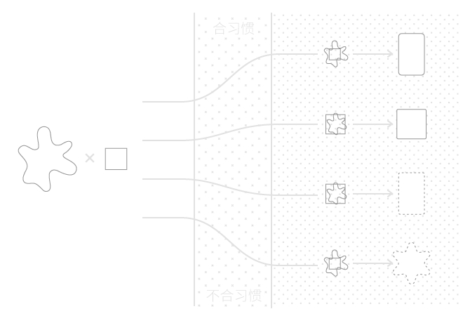 认识习惯并不是一件简单的事,设计师擅长的推己度人手段,通常是建立在主观体验而非理性分析之上的,极容易陷入一厢情愿和片面化。通常,设计师是受制于习惯,经验也是一种习惯,受制于习惯的结果,就是结局往往就是上图给出的第二条路线,而且是第二条路线指向的中庸的一面。而如果需要来挑战习惯了,那么就必须以理性的手段来研究和认识现有的习惯,找到它的生成源头和成长路径,唯有理性才能提供足够的力量去战胜旧习惯,就如 iOS 7 一般。习惯的拽引力可以从“黄金分割”这个简单的例子就可以看出,人们就是通过一些口口相传的话语,甚至就是这么一个词语“黄金分割”,就认为“黄金分割”是关于美和和谐的,而且会上升到非常高的高度,但是它的来由只是口口相传的经验和习惯,没作考证没作研究,而实际上“黄金分割”同美与和谐相关联,是一段薄弱和经不起推敲的发展历史(可参考阅读 Wikipedia 或者 Lynn Gamwell 的《Mathematics and Art: A Cultural History 》一书)。如果没有去考证一下“黄金分割”出处,或者仅仅知道 1.618 这个数字而不是数字的来源几何公式,那么就会被这些口口相传的习惯带着向前走,不可避免的走向中庸。