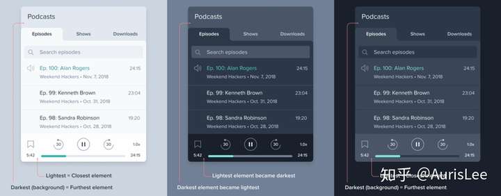 上面三幅界面中,如果第 1 幅是界面的浅色外观,那么它的深色外观,应该是像图 2 还是图 3 一样?不同的人可能会给出不一样的答案,但是从设计的专业角度来说,一般会选择图 3 的方案。这是因为,无论是浅色还是深色外观下,我们都应该在界面层级中,让离用户在逻辑关系上更近的颜色更亮一些。