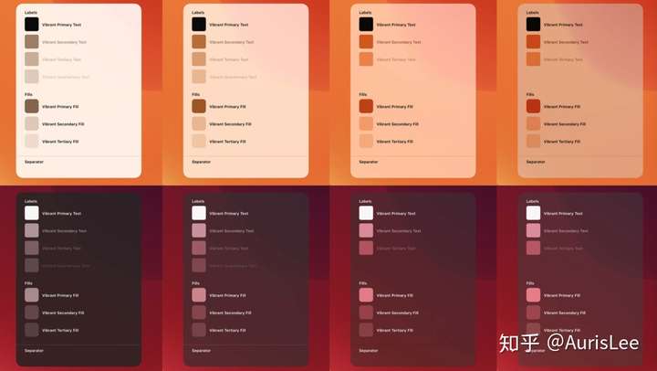 更重要的是,苹果还为材质上的内容颜色进行了单独的鲜活化(Vibrancy)处理。以下图为例,第一行的文字「Solid Color」为固定色彩,随着背景颜色的变更,到最后两幅图中几乎不可辨识了。第二行的「Vibrant」则为经过了鲜活化处理的文字效果,在背景色变亮时,也能保证文字的可读性。