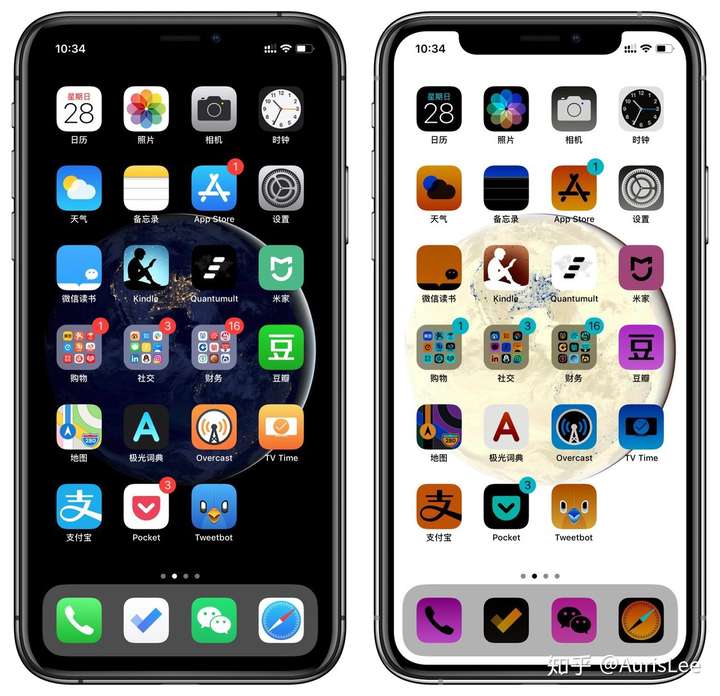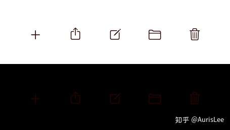 然而,即使抛开应用适配的问题,「智能反转」之所以不能成为真正意义上的 Dark Mode, 是因为这里面还有色彩对比度的问题。如下图所示,在浅色外观下的深棕色图标非常醒目,然而,如果背景色切换为深色,而图标颜色保持不变的话,这时候图标的辨认度就非常差了,如果你不非常仔细看的话,只会觉得下半部分是一片黑色。