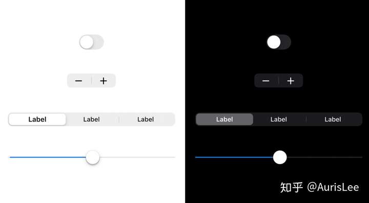 此外,苹果还更新了 UIKit 中的系统级控件,以适配深浅两种颜色外观。值得注意的是,在浅色模式下,许多元素是存在投影的,例如开关按钮、拖动条的拉动点……而到了深色外观中,这些投影被统统移除了,这也是苹果设计的细微精致之处。