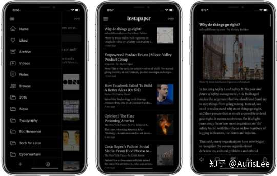 Dark Mode 在 iOS 13 上的呈现感不错,但距离完美还有一定距离。这其中既有客观因素,也有系统的主观原因。例如,iOS 的 Dark Mode 针对图像不会进行特别的处理,如果你的备忘录中有一张白色的照片,就会变得十分刺眼。而 Instapaper 在深色外观下,会自动暗化(Dimmed)处理内容中的图片元素。
