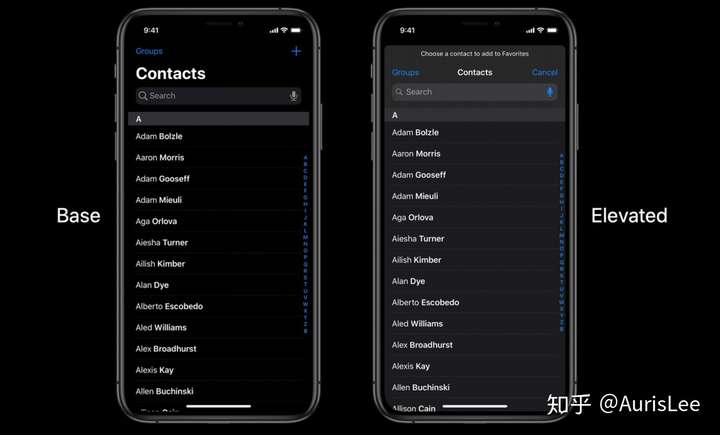 iOS 深色外观的背景色,是纯正的黑色(#000000),苹果称之为基底色(Base)。不过,这个背景色会随着界面层级的变化,而变成提亮色(Elevated)。下图就是一个例子:在左边的通讯录 app 中,背景色就是纯正的黑色。而到了右边的电话 app 中,有些操作会需要弹出浮层供你选择联系人,这时候浮在上方的界面背景色,就变成了亮一些的提亮色。