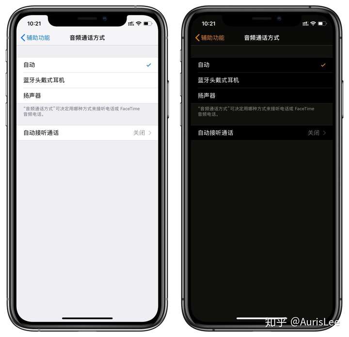这时候再来看一下,前文中提到的通过颜色反转实现的效果。你会发现,在原先的浅色外观下,可点击的「自动、蓝牙头戴式耳机、扬声器」这几条相比背景,是最亮的白色。然而,通过颜色反转的方式得到的深色外观中,这几条可操作区域变成了白色的对立面:完全的黑色,反而是界面的背景色更浅一些。